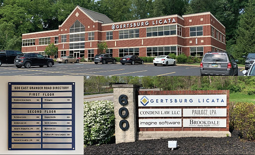 Design of exterior illuminated channel letters, changeable brushed aluminum directory board, and monument sign.